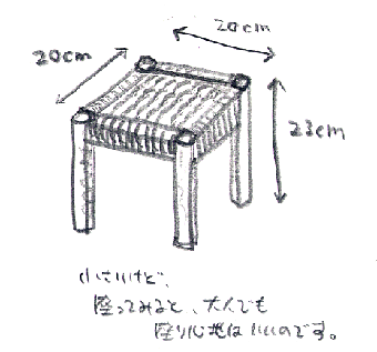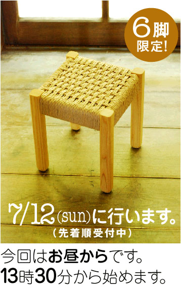 そして、チビ椅子編み編みワークも! 投稿日 2009-06-18投稿者 yukihira カテゴリーcolumn たぶん2時間ぐらいで編み上げてしまうと思います。 ※食事は付いておりません。 大人の椅子と大きさを比べてみると という感じです。 予約の仕方は7月5日のワークショップを参考に。 フレームの材はアッシュ1脚、オーク(ナラ)2脚、クルミ2脚、ブナ1脚です。この中から先着順で選んで頂きます。 7月5日のスタンダードなタイプの編み編みワークショップも含めて、よろしくお願い致します。